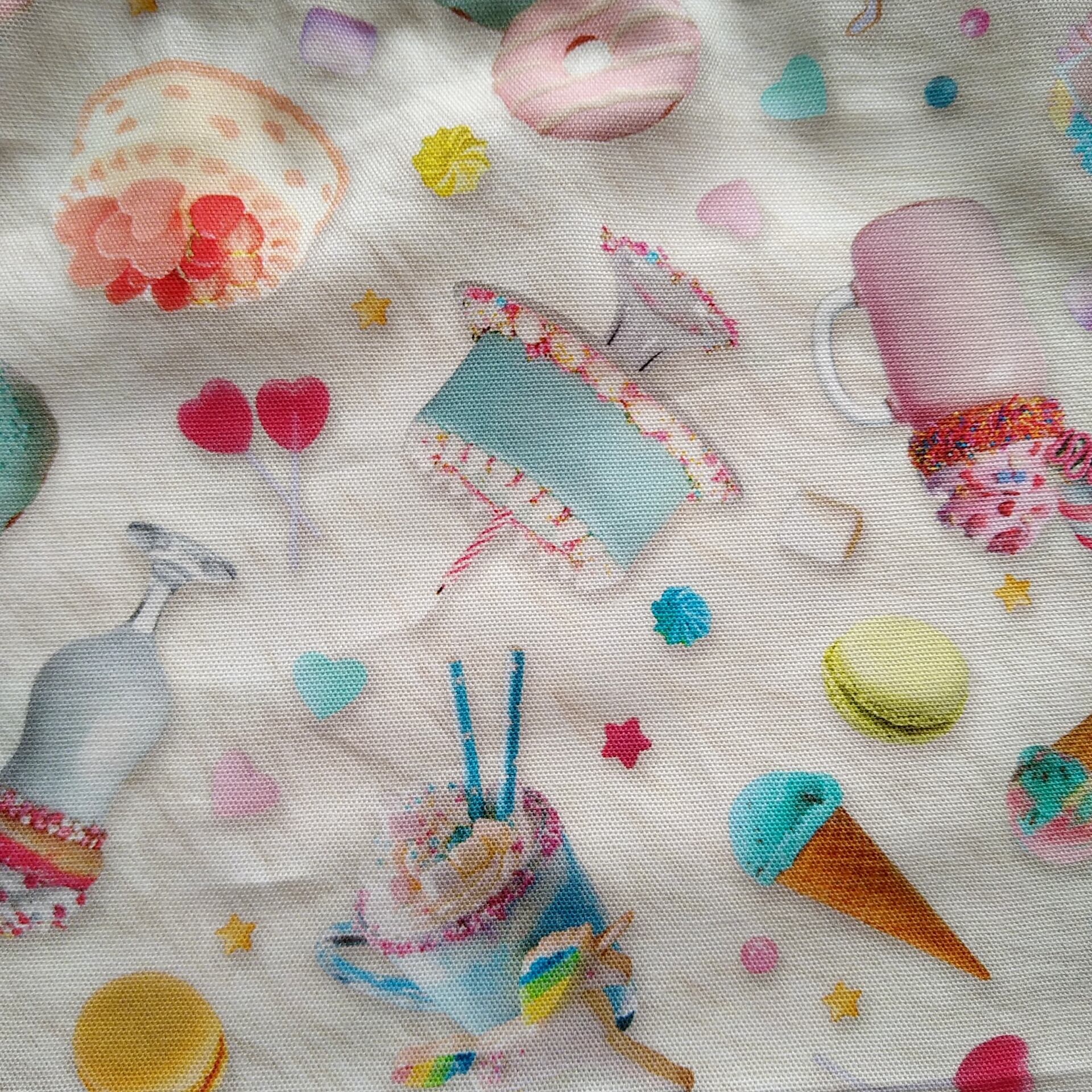 ポップで可愛いスイーツが並んだ上履き袋・給食袋サイズの巾着。